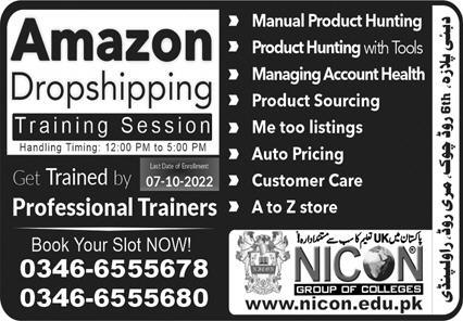 NICON Group of Colleges has announced admissions 2022 for Short Courses in Manual Product Hunting, Product Hunting, Managing Account Health, Product Sourcing, Me too Listening, Auto Picking, Customer Care.. Students who want to take admissions in NICON Group of Colleges Rawalpindi Punjab Pakistan for academic year 2022 to continue education in Technical Course can apply. Students who want to enroll for academic session 2022 in Course qualification and admission criteria for Private institute can apply till last date 7 October 2022. Read newspaper ad for exact details.