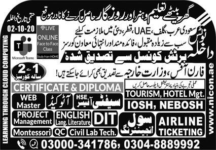 NICON Training Institute has announced admissions for diploma in Tourism, Hotel Management, IOSH, NEBOSH, Safety Officer HSE, Auto CAD, Webmaster, Airline Ticketing, Civil Engineering, DIT, English Language Literature, Project Management, Montessori, QC and Civil Lab Technician. Read newspaper ad for exact details.