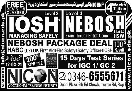 NICON Vocational Training Institute has announced admissions for Certificate, Diploma and Courses in IOSH & NEBOSH in Rawalpindi Punjab Pakistan 2021. Read newspaper ad for exact details.