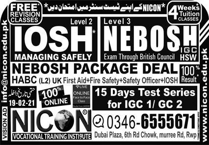 NICON Vocational Training Institute has announced admissions for diploma and courses in IOSH Managing Safety and NEBOSH in Rawalpindi Punjab Pakistan 2021. Read newspaper ad for exact details.