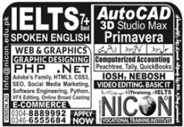 NICON Vocational Training Institute is offering admissions for courses in IELTS, Spoken English, Web & Graphics, PHP, Dot Net, AutoCAD, 3D Studio Max, Primavera, Civil Surveyor, Quantity Surveyor, Draftsman etc. Read newspaper ad for exact details.