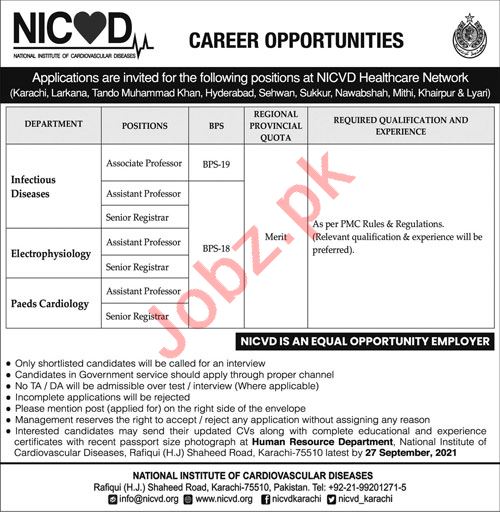 National Institute of Cardiovascular Diseases NICVD Karachi, Government of the Sindh is looking individuals for the posts of Associate Professor, Assistant Professor, Registrar, Senior Registrar, Professor, Professor Infectious Diseases, Professor Electrophysiology, Professor Paeds Cardiology.