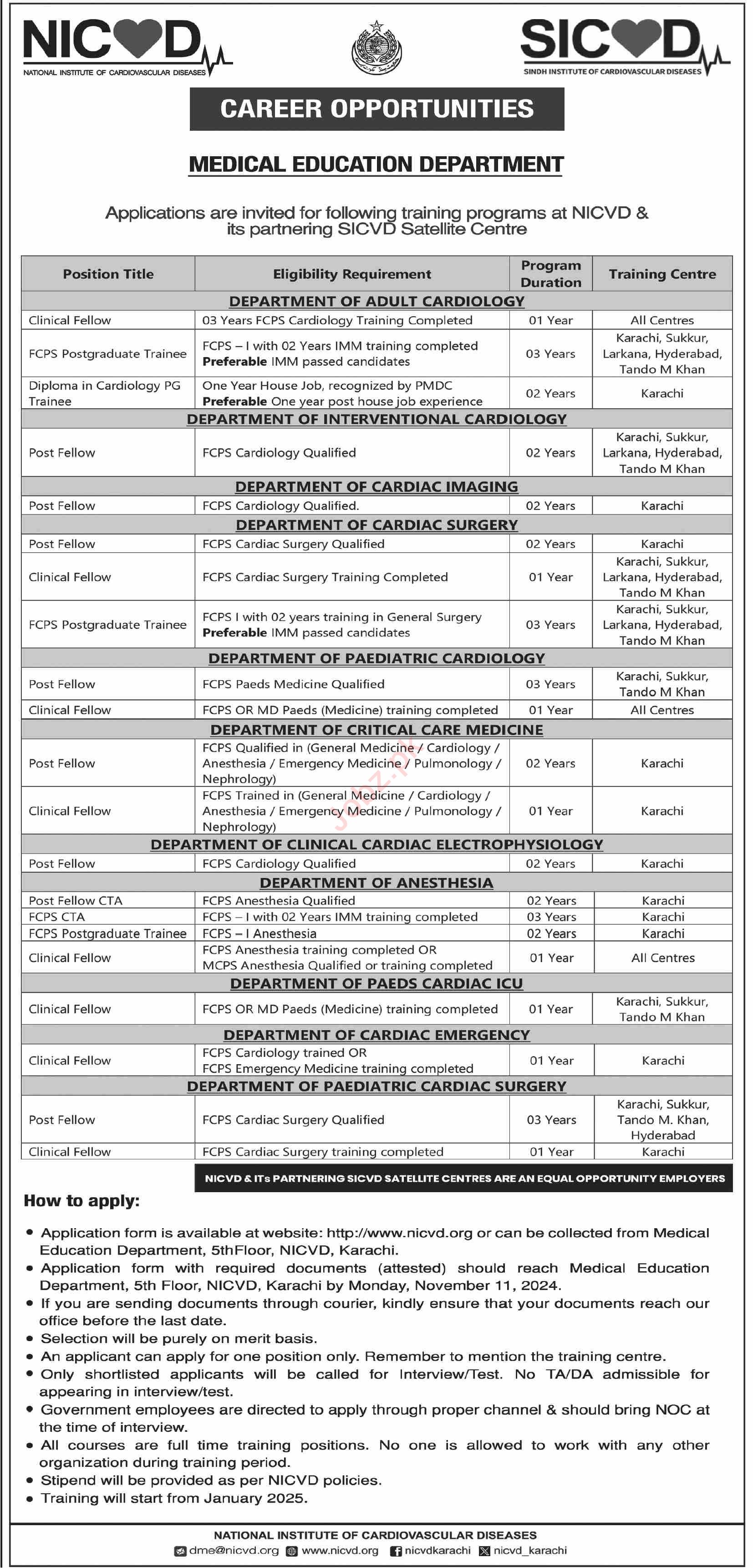 National Institute of Cardiovascular Diseases NICVD jobs advertisement dated about 28 October 2024 in daily Dawn Newspaper invites application for the vacant post of fcps postgraduate trainee, diploma in cardiology pg trainee, post fellow and clinical fellow in Karachi, karachi Sindh Pakistan. MBBS and P.G Diploma etc. educational qualification will be preferred.