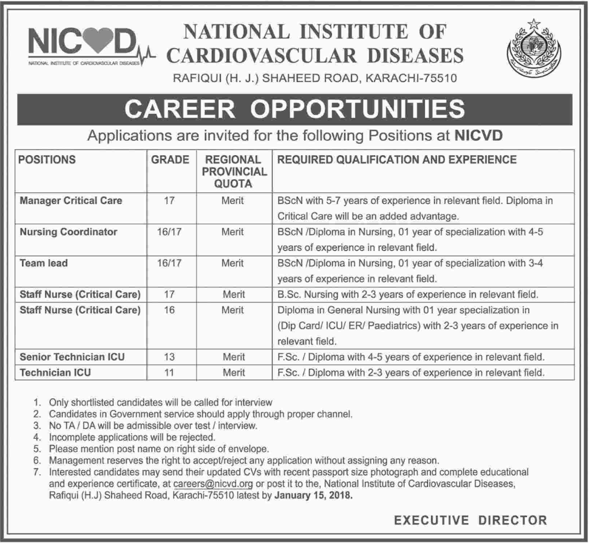 Latest National Institute of Cardiovascular Diseases NICVD Medical Posts Karachi 2025