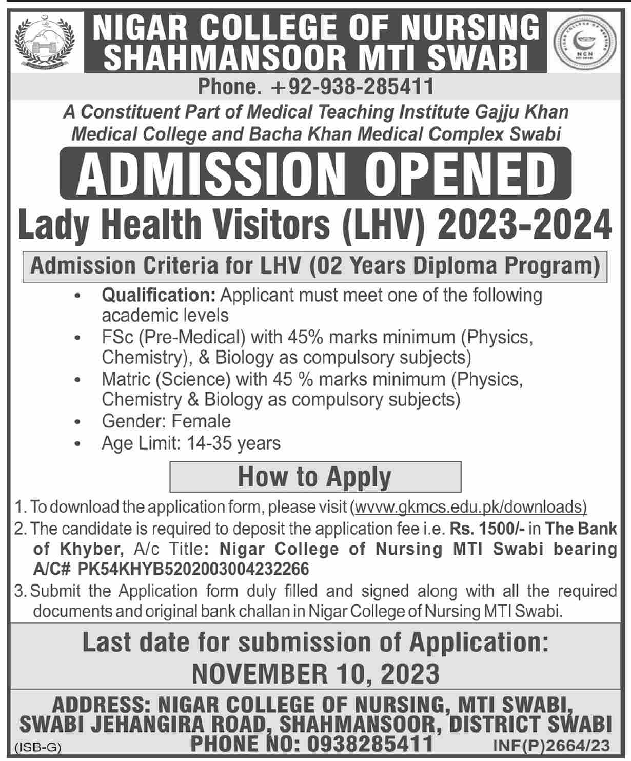 Nigar College of Nursing Shahmansoor MTI Medical Teaching Institution, Gajju Khan Medical College & Bacha Khan Medical Complex Swabi 2 Years Diploma in Lady Health Visitor, LHV Diploma, admissions 2023 has been started. Eligible students who qualify as per admission criteria in Medical Teaching Institution Swabi Khyber Pakhtunkhwa KPK Pakistan can apply in Medical College for academic year 2023. Students for admissions in Course and Diploma can apply for online or campus classes as per Government institute criteria till admission closing date November 10, 2023. Read newspaper ad for exact details.