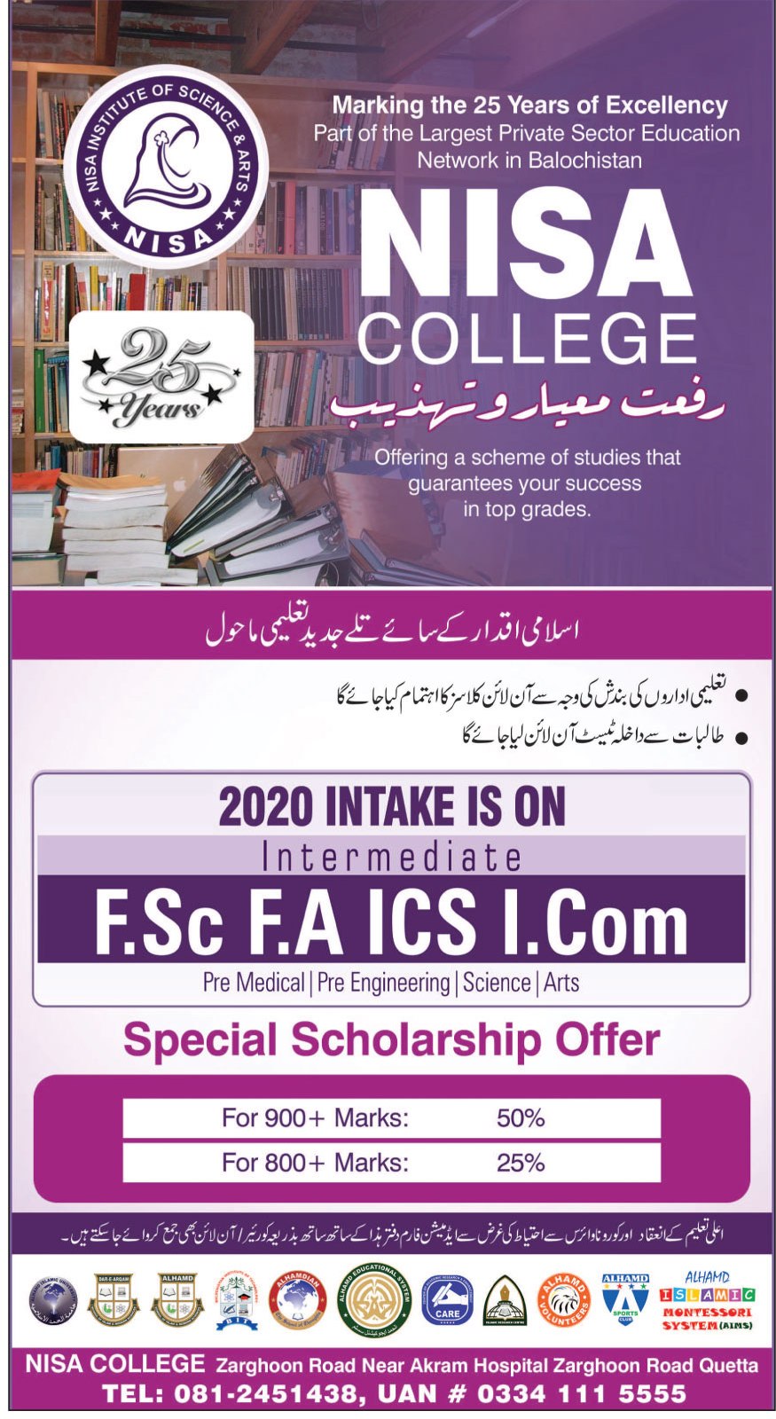 NISA Institute of Science and Technology Quetta, Pakistan is starting admissions fall 2020 for the classes of FA, ICS, I Com, F Sc in Pre Medical and Pre Engineering. Read newspaper ad for exact details.
