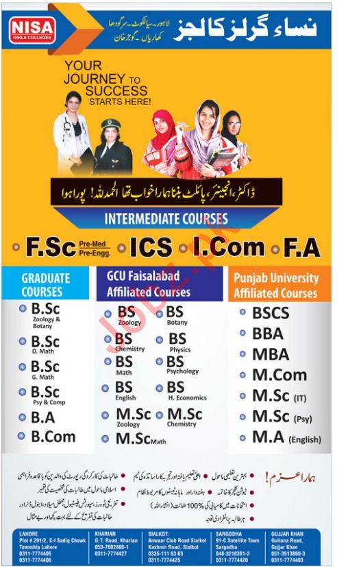 Nisa Girls College Lahore Campus, Pakistan are announced admissions spring 2019 for the classes of F Sc, ICS, I Com, FA, B Sc BS, BSCS, BBA, MBA, M Com, MSc. Read newspaper ad for exact details.