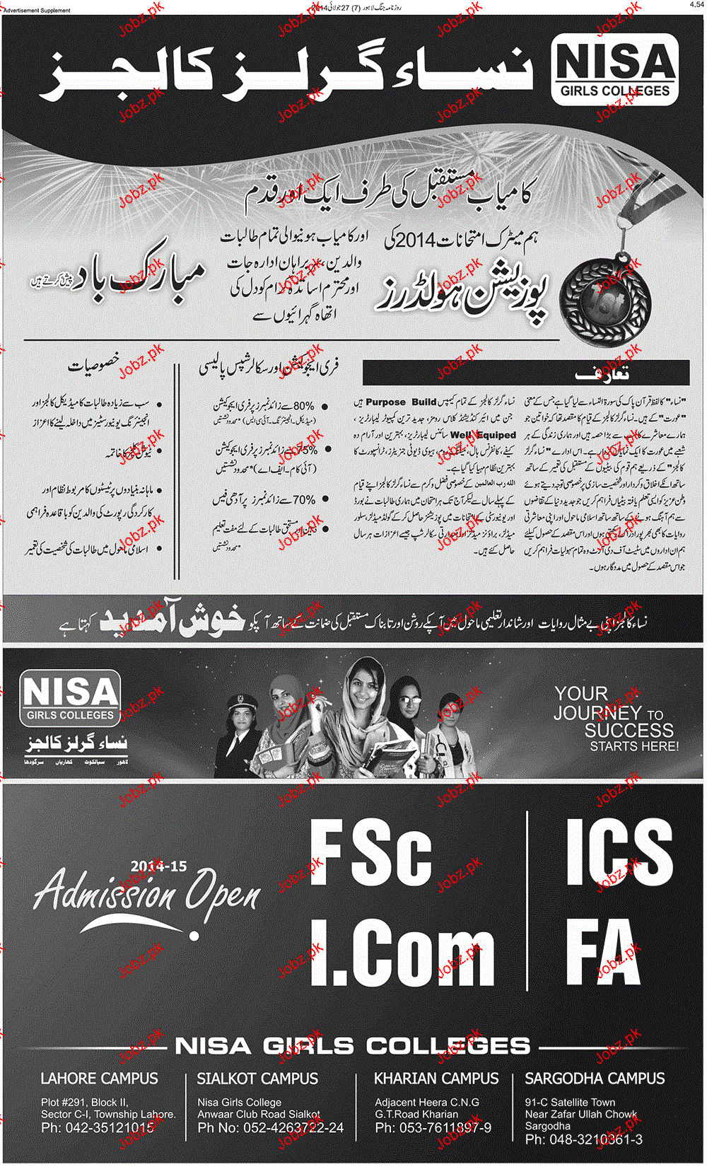 Nisa Girls Colleges Admission in Fsc and ICs in Sialkot. Read newspaper ad for exact details.