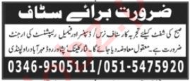 Vacant posts including staff nurse, dispenser and female receptionist are announced in Nisar Clinic Rawalpindi, rawalpindi Punjab Pakistan as per 28 April 2024 advertisement in daily Jang Newspaper. Preferred Education is Intermediate, Bachelor and Matric etc.