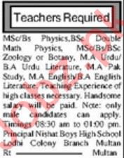 Nishat Boys High School Jobs 2020 For Teaching Staff