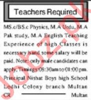 Vacancies in Nishat Boys High School Advertisement December 2019
