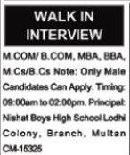 Nishat Boys High School is looking for candidates for following posts as per job advertisement published in daily Nawaiwaqt Newspaper of January 12, 2024 for location Multan, multan Punjab Pakistan: