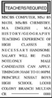 Nishat Boys High School invites applications for job positions advertised in daily Khabrain dated 20 January 2024 for following vacancies in Multan, multan Punjab Pakistan.