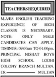 Nishat Boys High School jobs advertisement dated about 15 January 2025 in daily Khabrain Newspaper invites application for the vacant post of english teacher and teacher in Multan, multan Punjab Pakistan. Candidates with MA etc. educational background will be preferred.
