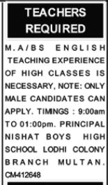 Vacant posts including teacher and english teacher are announced in Nishat Boys High School Multan, multan Punjab Pakistan as per 22 January 2025 advertisement in daily Nawaiwaqt Newspaper. Candidates with MA etc. educational background will be preferred.
