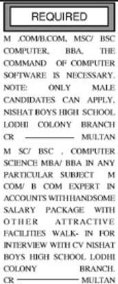 Nishat Boys High School latest Classifieds Education jobs and others can be applied till 20 May 2023 or as per closing date in newspaper ad. Read complete ad online to know how to apply on latest Nishat Boys High School job opportunities. Learn today skills like Education & Tutoring, Account Management, Accounting, Software Engineering and Computer Science to apply confidently on these Nishat Boys High School jobs.