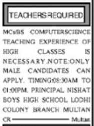 Nishat Boys High School Multan, multan Punjab Pakistan invites applications from eligible candidates for the post of teaching staff and computer science teacher as per advertisement of October 31, 2024 published in daily Khabrain Newspaper. Persons with Bachelor, MS and Master etc. education can apply.