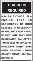 Nishat Boys High School Multan, multan Punjab Pakistan invites applications from eligible candidates for the post of teacher, physics teacher and english teacher as per advertisement of September 19, 2022 published in daily Nawaiwaqt Newspaper. Preferred Education is Master and Bachelor etc.