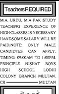 Nishat Boys High School invites applications for job positions advertised in daily Khabrain dated 2 January 2023 for following vacancies in Multan, multan Punjab Pakistan.