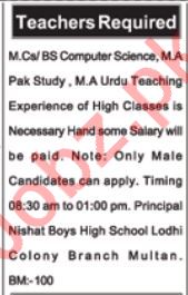 Latest Nishat Boys High School Teaching Posts Multan 2025