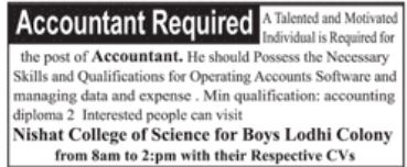 Latest Accounting jobs and others Private walk in interview jobs in Nishat College of Science closing date is around April 12, 2025, see exact from ad. Read complete ad online to know how to apply on latest Nishat College of Science job opportunities.