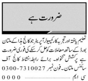 Nishat College Of Science Multan Jobs 2021 Computer Operator
