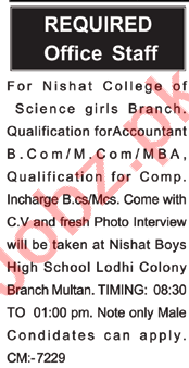 Nishat College Of Science Multan Jobs 2021 For Accountant