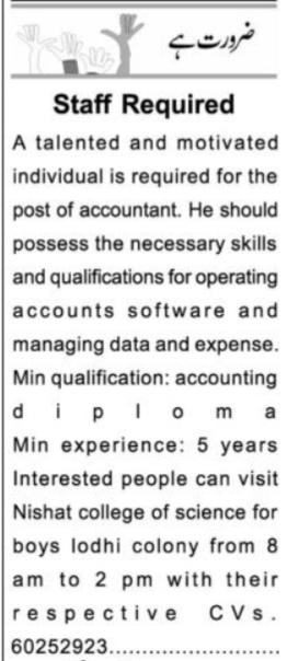 Nishat College of Science jobs advertisement dated about 20 March 2025 in daily Express Newspaper invites application for the vacant post of accounts officer and accountant in Lodhi Colony Multan, multan Punjab Pakistan. Persons with B.com and Bachelor etc. education can apply.