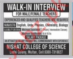 Nishat College of Science Multan Teaching Staff Jobs 2021