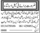 Apply as per details in job advertisement. Login to view further details of how to apply via https://www.jobz.pk online.