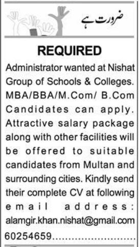 Nishat Group of Schools and Colleges invites applications for job positions advertised in daily Express dated 7 June 2025 for following vacancies in Lodhi Colony Multan, multan Punjab Pakistan.