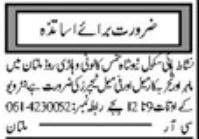 Vacant posts including teacher and female teacher are announced in Nishat High School Multan, multan Punjab Pakistan as per 9 January 2025 advertisement in daily Khabrain Newspaper. Persons with Bachelor and Master etc. education can apply.
