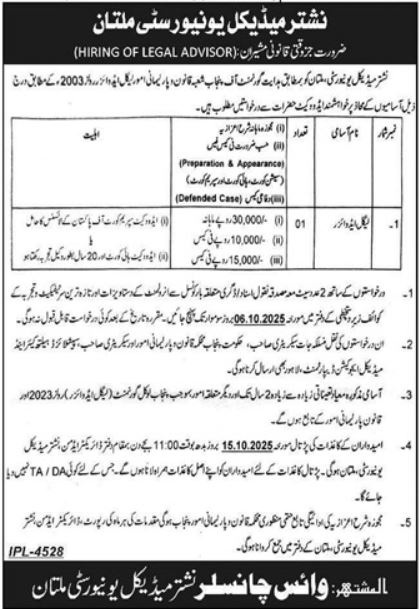 Nishtar Medical University NMU jobs advertisement dated about 9 September 2025 in daily Khabrain Newspaper invites application for the vacant post of legal advisor in Multan, multan Punjab Pakistan. Persons with Bachelor etc. education can apply.