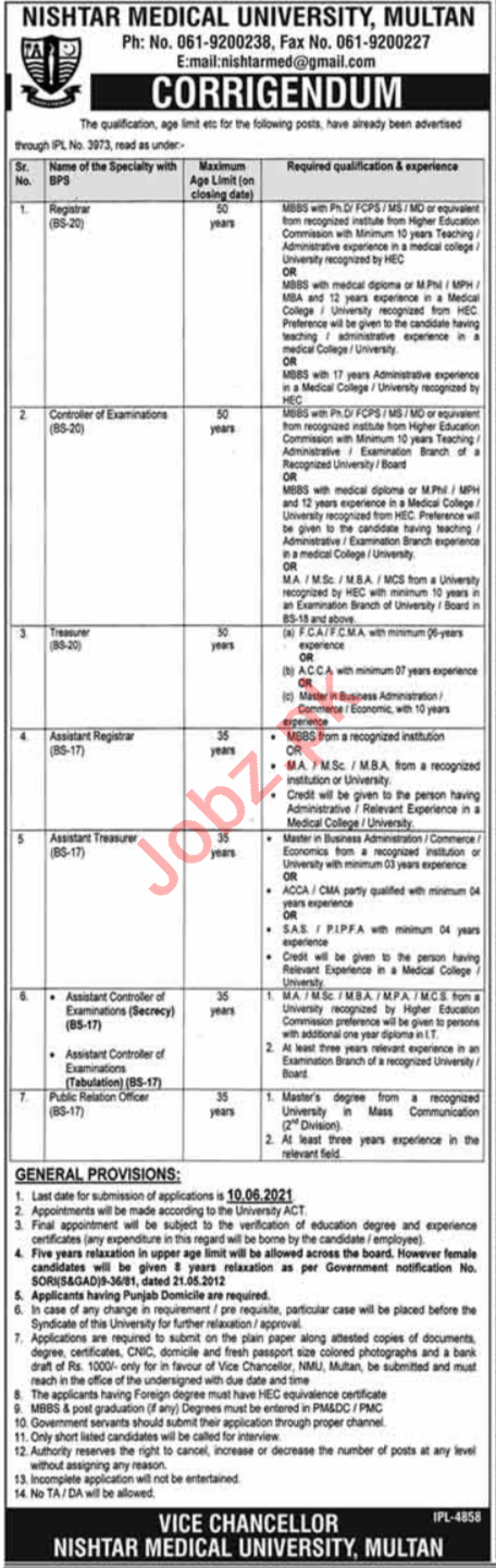 Nishtar Medical University NMU Multan Jobs 2021 Registrar