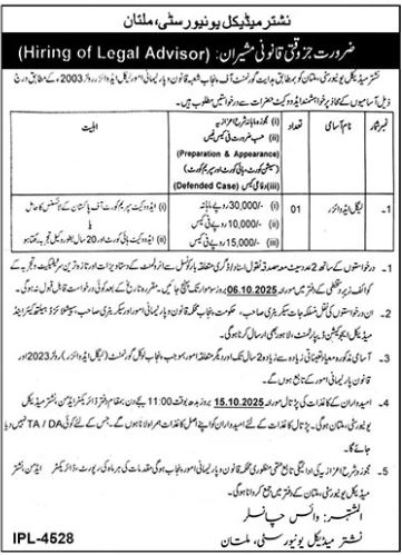 Vacant posts including legal advisor are announced in Nishtar Medical University NMU Nishtar Road Multan, multan Punjab Pakistan as per 9 September 2025 advertisement in daily The News Newspaper. LLM, LLb, BA and Bachelor etc. educational qualification will be preferred.