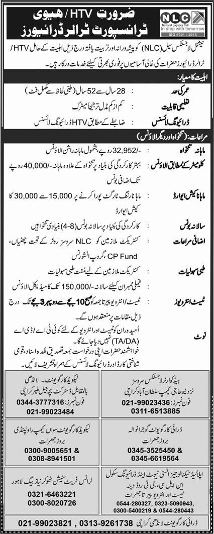 National Logistics Cell NLC Rawalpindi, lahore, karachi and gujranwala Punjab Pakistan invites applications from eligible candidates for the post of htv driver, traila driver and driver as per advertisement of December 11, 2022 published in daily Express Newspaper. Matric etc. educational qualification will be preferred.
