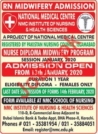 NMC Institute of Nursing & Health Sciences, National Medical Center has announced admissions 2020 for Nurse Diploma Midwifery Program in Karachi. All Student submit their admissions form before deadline. Read newspaper ad for exact details.