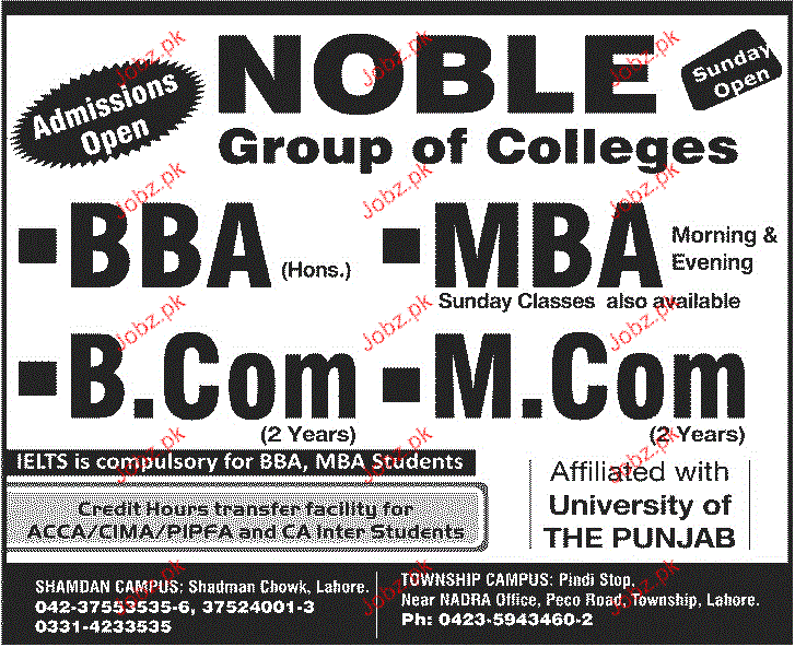 Nobel Group of Colleges Admission in BBA, MBA, COm and MCom in Lahore Read newspaper ad for exact details.