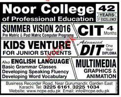 Noor College Admission in DIT and CIT in Karachi. Read newspaper ad for exact details.