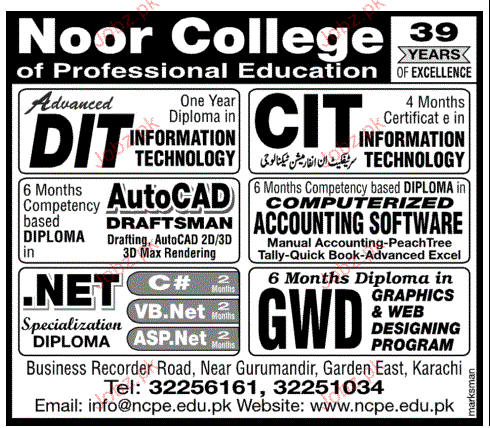 Noor College of Professional Education Admission in DIT, CIT, .Net and Gwd in Karachi Read newspaper ad for exact details.