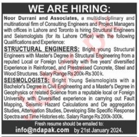 Vacant posts including seismologist and structural engineer are announced in Noor Durrani & Associates Lahore, lahore Punjab Pakistan as per 14 January 2024 advertisement in daily Jang Newspaper. Candidates with Master etc. educational background will be preferred.