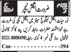 Noor e Hayat English Language Center is looking for candidates for following posts as per job advertisement published in daily Jang Newspaper of October 15, 2022 for location Quetta, quetta Balochistan Pakistan: