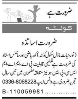 Noor e Hayat Model School invites applications for job positions advertised in daily Express dated 15 August 2025 for following vacancies in Quetta, quetta Balochistan Pakistan.