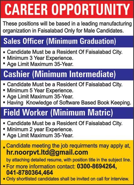 Noor Group of Companies Faisalabad, faisalabad Punjab Pakistan invites applications from eligible candidates for the post of cashier, field worker and sales officer as per advertisement of October 6, 2022 published in daily Express Newspaper. Candidates with Bachelor, Intermediate and Matric etc. educational background will be preferred.