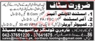 Northern Toolings Pvt Limited jobs advertisement dated about 20 April 2025 in daily Jang Newspaper invites application for the vacant post of office assistant, computer operator and assistant account officer in Lahore, lahore Punjab Pakistan. Candidates with Bachelor, MS and Master etc. educational background will be preferred.