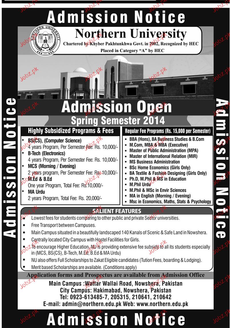 Northern University Admission in BS, B-Tech, BBA, MS, BA, MCs, Mpill and Phd in Nowshera Read newspaper ad for exact details.