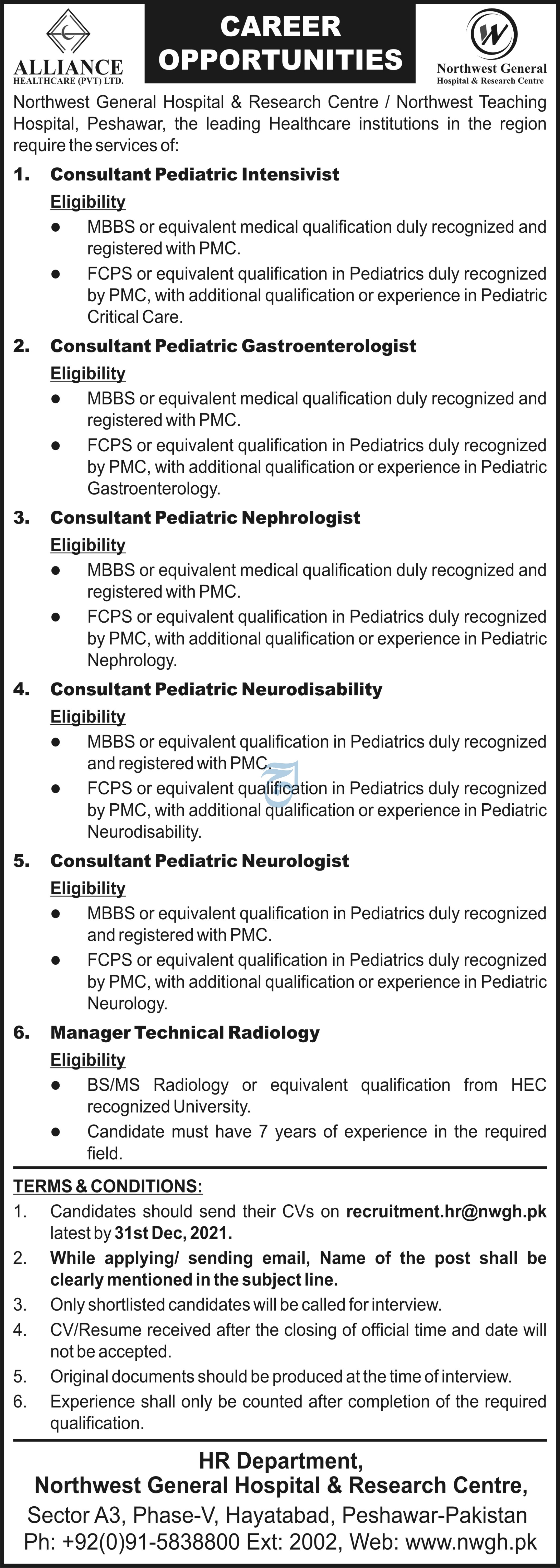 Northwest General Hospital & Research Center Peshawar, Pakistan seeks services for Consultant Pediatric Intensivist, Consultant Pediatric Gastroenterologist, Consultant Pediatric Nephrologist, Consultant Pediatric Neurodisability, Consultant Pediatric Neurologist, Manager Technical Radiology.