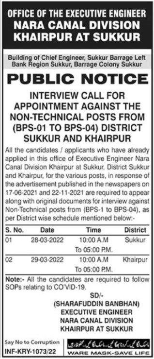 Notice For Interviews For Jobs At Canal Division Khairpur