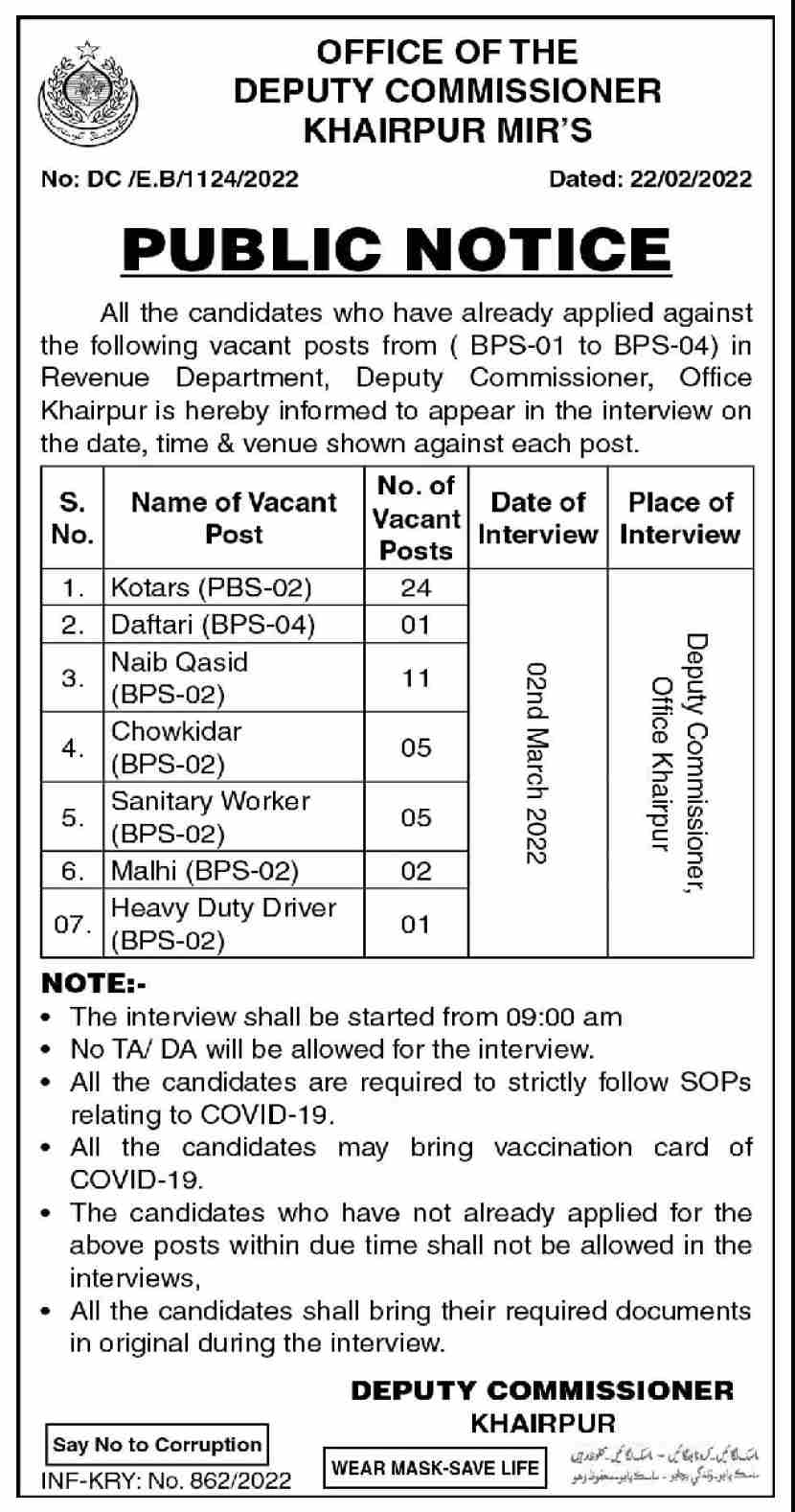 Deputy Commissioner District Office invites applications for job positions advertised in daily Dawn dated 24 February 2022 for following vacancies in Khairpur, khairpur Sindh Pakistan.
