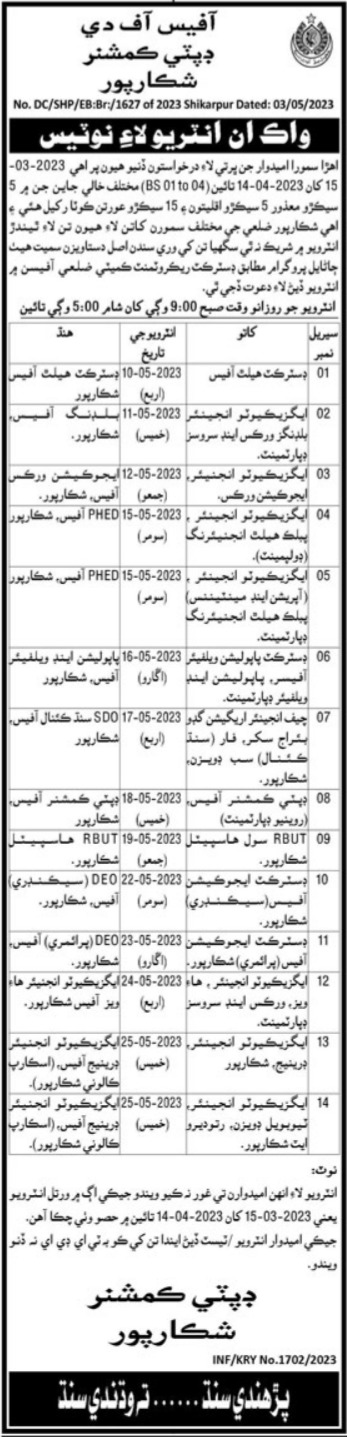Vacant posts including bps one to bps four staff are announced in Deputy Commissioner Office Shikarpur, shikarpur Sindh Pakistan as per 5 May 2023 advertisement in daily Kawish Newspaper. Primary and Middle etc. educational qualification will be preferred.
